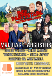 Der PartyStadl mit Rick und Jeffry is een feestje vol van gezelligheid. Met zowel steirische harmonika/accordeonklanken, schlagers en feestmuziek in verschillende muziekgenres. Geniet van een fantastische avond vol live muziek, laat je betoveren door de sfeer, de accordeonklanken en het talent van de artiesten. Dit is dé perfecte avond om samen te komen met vrienden en familie voor een onvergetelijk feest. Op 1 augustus treden Duo De Widia’s, Colin Martin, Yoerie Heijltjes en Rick & Jeffry op.